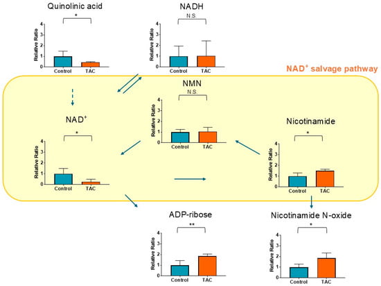 Figure 5. NAD+-related metabolites measured by metabolomic analysis. Orange columns represent the TAC group, and blue columns represent the Control group. The vertical axis is the relative ratio. The ratio was calculated as follows: the relative ratio = normalized ratio of Tac group/normalized ratio of control group. Solid arrows indicate relationships between metabolites and their precursors. A dotted arrow indicates an indirect relationship to metabolite production. The yellow area shows the NAD+ salvage pathway and its components. (* p < 0.05, ** p < 0.01) (n = 5/group). NAD+: Nicotinamide adenine dinucleotide; NMN: Nicotinamide mononucleotide; N.S.: not significant.