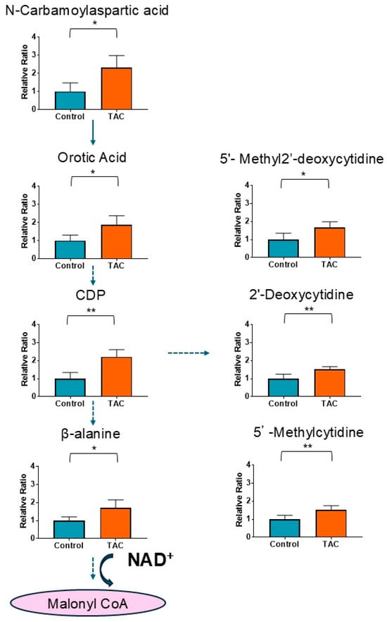 Figure 6. Cytosine-related metabolites measured by metabolome analysis. Orange columns represent the TAC group, and blue columns represent the Control group. The vertical axis is the relative ratio. The ratio was calculated as follows: the relative ratio = normalized ratio of Tac group/normalized ratio of control group. A Solid arrow indicates relationships between metabolites and their precursors. Dotted arrows indicate indirect relationships to metabolite production. Malonyl CoA was not detected. (* p < 0.05, ** p < 0.01) (n = 5/group). CDP: cytidine diphosphate; NAD+: Nicotinamide adenine dinucleotide.