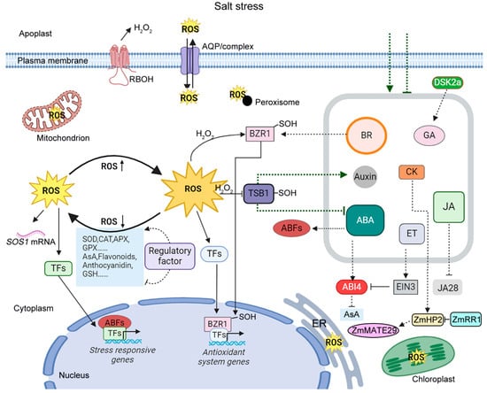 Apart from the extracellular space, ROS are also produced in various cellular compartments, such as mitochondria, the cytosol, peroxisomes, and the endoplasmic reticulum [,]. Salt stress could also damage the ultrastructure of chloroplasts, resulting in the generation of H2O2 and O2•¯ in chloroplasts []. Due to the fact that aquaporins (AQPs) identified on the plasma membrane and organelle membranes promote the bidirectional transportation of H2O2, the H2O2 level within the cytoplasm can influence the H2O2 level in other cellular compartments, and vice versa [].