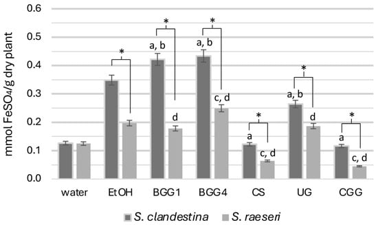FRAP activity of the natural deep eutectic extracts of SC and SR. The letters and the asterisks denote statistical significance (p < 0.05) as follows: a, vs. SC-EtOH; b. vs. SC-H2O; c, vs. SR-EtOH; d, vs. SR-H2O; *, vs. the same extract from the other taxon.