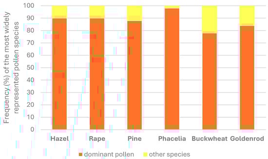 The selection of monofloral pollen diets was dictated by the common occurrence of plant pollen in a temperate climate. Fresh pollen was collected using pollen traps mounted in front of hives belonging to beekeepers from the Lubelskie and Podkarpackie provinces (Poland). The pollen was manually sorted by color to obtain the dominant pollen from a specific plant in each sample []. To confirm the botanical origin, microscopic preparations were made and analyzed using the methods described by Filipiak et al. []. Microscopic pollen preparations were then used to confirm the identity of the pollen through morphological features. Samples were examined using a microscope MBL 800 at a 40 × 15 magnification. At least 300 pollen grains were counted per slide, with two replicate counts for each slide. Pollen assignation was performed to the most accurate taxon (species, genus). Pollen load samples were obtained from wind-pollinated plants, i.e., hazel (Corylus sp.) and pine (Pinus sylvestris L.), and insect-pollinated plants, i.e., rapeseed (Brassica napus L.), Phacelia (Phacelia tanacetifolia Benth), buckwheat (Fagopyrum esculentum Moench), and goldenrod (Solidago sp.). The percentage of the dominant pollen in the sample is presented in Figure 1.