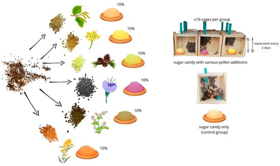 The sorted pollen was frozen at −25 °C until the preparation of sugar candy with the respective pollen types. Commercial sugar candy (Apifonda, Łysoń, Poland) was divided into seven equal parts. The first part did not contain any pollen supplement (bees from the control group were fed with it). To the remaining parts of sugar candy, one of the six types of pollen, previously micronized using an electric mill, was added at a concentration of 10% (Figure 2). The addition of 10% pollen in this experiment was valid economically, confirmed by its effectiveness [], and was also based on the theoretical protein requirement of bees at an approximate ratio of 10% protein and 90% carbohydrates according to Altaye []. The manually mixed candy batches were frozen at −25 °C and gradually thawed before feeding the bees.