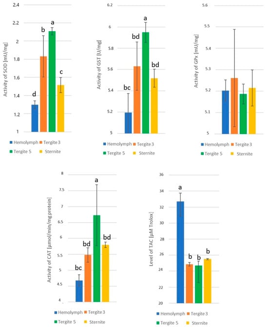 Superoxide dismutase (SOD), glutathione S-transferase (GST), glutathione peroxidase (GPx), and catalase (CAT) activities and total antioxidant capacity (TAC) levels in the hemolymph and fat body from tergite 3, tergite 5, and sternite in 1-day-old workers; a,b,c,d—differences between tissues/location for individual enzymes significant at p ≤ 0.01; n = 10; vertical bars indicate standard deviation.