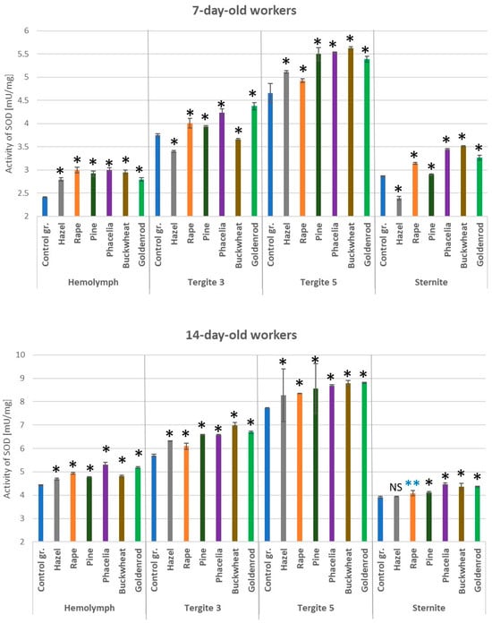 Superoxide dismutase (SOD) activities in the hemolymph and fat body from tergite 3, tergite 5, and sternite in the 7- and 14-day-old workers fed sugar candy only and in those fed sugar candy with various pollen additions; *—differences between the pollen-fed workers and the control group workers in the same tissues/locations are significant at p = 0.01; **—p = 0.05; n = 10; NS—not significant; vertical bars indicate standard deviation.