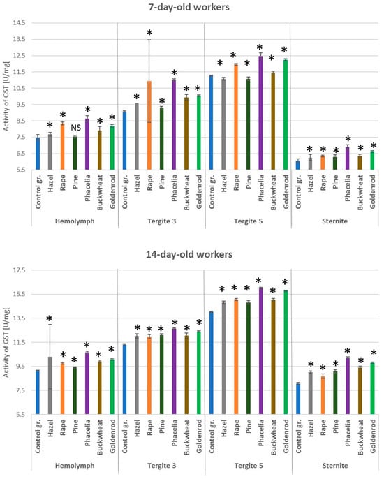 Glutathione S-transferase (GST) activities in the hemolymph and fat body from tergite 3, tergite 5, and sternite in the 7- and 14-day-old workers fed sugar candy only and in those fed sugar candy with various pollen additions; *—differences between the pollen-fed workers and the control group workers in the same tissues/locations are significant at p = 0.01; n = 10; NS—not significant; vertical bars indicate standard deviation.