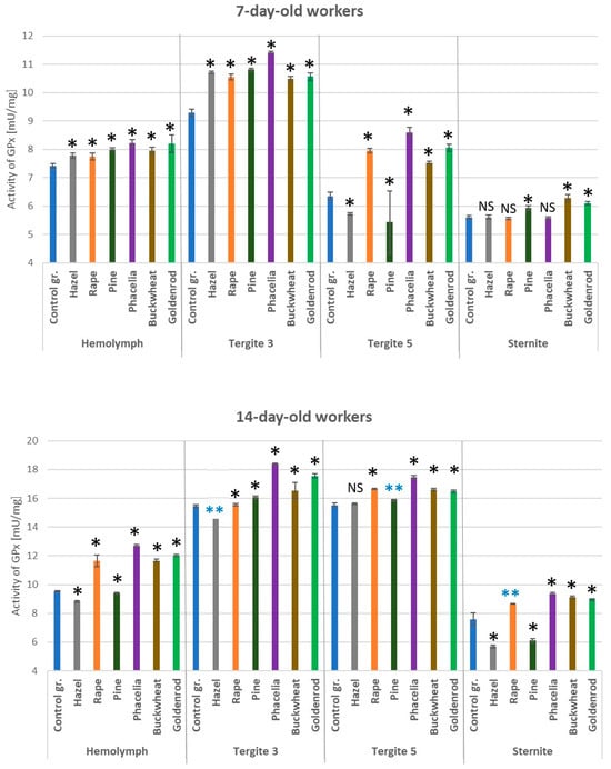 Glutathione peroxidase (GPx) activities in the hemolymph and fat body from tergite 3, tergite 5, and sternite in the 7- and 14-day-old workers fed sugar candy only and in those fed sugar candy with various pollen additions; *—differences between the pollen-fed workers and the control group workers in the same tissues/locations are significant at p = 0.01; **—p = 0.05; n = 10; NS—not significant; vertical bars indicate standard deviation.