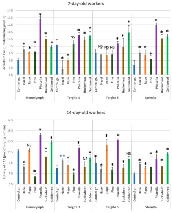 Catalase (CAT) activities in the hemolymph and fat body from tergite 3, tergite 5, and sternite in the 7- and 14-day-old workers fed sugar candy only and in those fed sugar candy containing various pollen additions; *—differences between the pollen-fed workers and the control group workers in the same tissues/locations are significant at p = 0.01; **—p = 0.05; n = 10; NS—not significant; vertical bars indicate standard deviation.