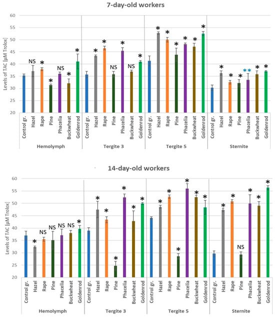 Total antioxidant capacity (TAC) levels in the hemolymph and fat body from tergite 3, tergite 5, and sternite in the 7- and 14-day-old workers fed sugar candy only and in those fed sugar candy containing various pollen additions; *—differences between the pollen-fed workers and the control group workers in the same tissues/locations are significant at p = 0.01; **—p = 0.05; n = 10; NS—not significant; vertical bars indicate standard deviation.