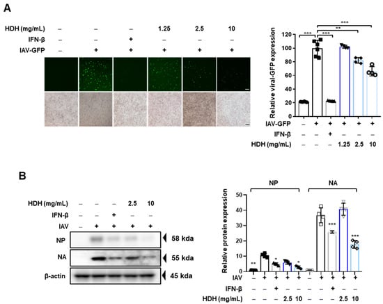 To investigate the anti-influenza A virus (IAV) effects of HDH, RAW 264.7 cells were treated with various concentrations of HDH (1.25, 2.5, and 10 mg/mL) for 24 h. Following this pre-treatment, the cells were infected with the A/PR8/34–GFP virus (multiplicity of infection [MOI] = 5), a strain of IAV engineered to express green fluorescent protein (GFP) as a marker of infection. As shown in Figure 1A, treatment with HDH led to a dose-dependent reduction in viral GFP expression, indicating a marked decrease in viral replication.