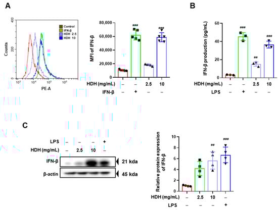 HDH enhanced the expression of IFN-β in Raw264.7 cells. The cells were treated with HDH at concentrations of 2.5 and 10 mg/mL for 24 h. (A) IFN-β expression levels were measured by intracellular staining followed by flow cytometry. (B) The IFN-β secretion was measured using an ELISA Kit. (C) Expression of IFN-β was assessed by Western blotting (left) and quantified using ImageJ software (right). The experiment was performed three times independently. Bar graph (mean ± SEM) statistics were determined using a one-way ANOVA with Tukey’s post hoc test; ### p < 0.001 and ## p < 0.01 compared with the untreated group.