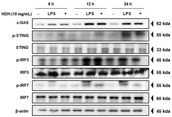 HDH activates the cGAS-STING pathway in Raw264.7 cells. The cells were treated with HDH at concentrations of 10 mg/mL for 6, 12, and 24 h. cGAS, STING, IRF3, and IRF7 were tracked by Western blotting.