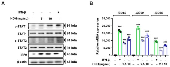 HDH increased the activity of the interferon signaling pathway. Raw264.7 cells were treated with HDH at concentrations of 2.5 and 10 mg/mL for 24 h. (A) The expression of STAT1, STAT2, and IRF9 was analyzed by Western blot after isolating proteins from the cells. (B) The expression of ISG15, ISG20, and ISG56 were detected by RT-PCR. The experiment was performed three times independently. Bar graph (mean ± SEM) statistics were determined using a one-way ANOVA with Tukey’s post hoc test; ### p < 0.001 compared with the untreated group.