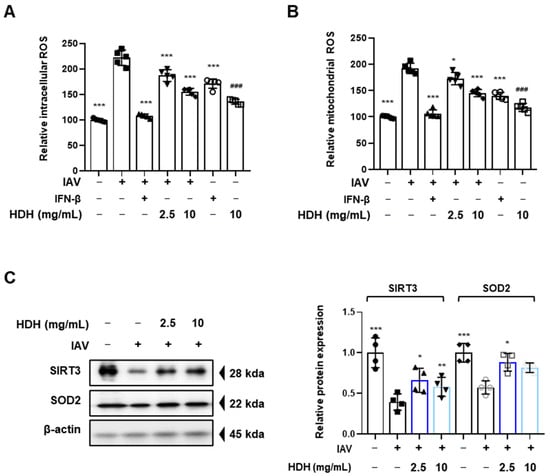 Antioxidant effect of HDH on IAV-infected Raw264.7 cells. The cells were pre-treated with HDH at concentrations of 2.5 and 10 mg/mL before infection with IAV. (A) Intracellular ROS were measured by DCF-DA, and (B) mitochondrial ROS were measured by staining by MitoSOX following by flow cytometry. (C). The expression of SIRT3 and SOD2 were assessed by Western blotting (left) and quantified using ImageJ software (right). The experiment was performed three times independently. Bar graph (mean ± SEM) statistics were determined using a one-way ANOVA with Tukey’s post hoc test; *** p < 0.001, ** p < 0.01, and * p < 0.05 compared with the virus infection group. ### p < 0.001 compared with the untreated group.