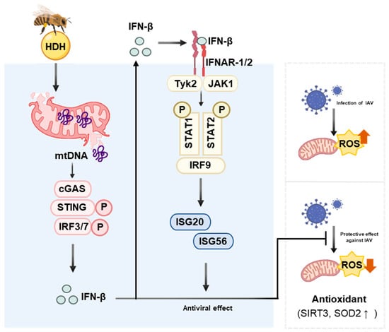 Protective effect of HDH against IAV via activation of the innate immune system. HDH enhances the secretion of IFN-β though the cGAS-STING pathway. Additionally, HDH suppresses viral infection by increasing antiviral signaling pathways and reduces reactive oxygen species levels increased by viral infection.