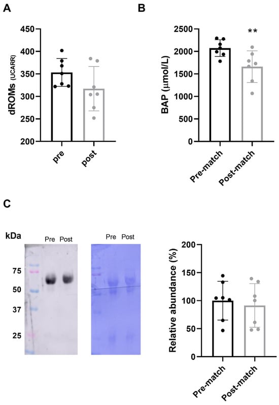 To confirm the absence of oxidative stress 48 h post-match, we evaluated the total plasma carbonylation, which is a well-documented marker of protein oxidation. The results, reported in Figure 1C, indicated that the levels of protein carbonylation pre- and post-match were comparable with a slight difference and were not statistically significant (post-match 90.6%; p = 0.414). These data agreed with d-ROMs analysis, confirming the absence of oxidative stress at 48 h post-match.