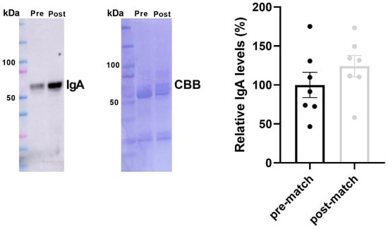 Salivary IgA levels at 24 h pre and 48 h post-match. Representative immunoblot image and relative quantification using the Coomassie brilliant blue-stained membrane (CBB) of IgA in salivary samples pre- and post-match. St: BioRad Precision Plus Protein™ standards.