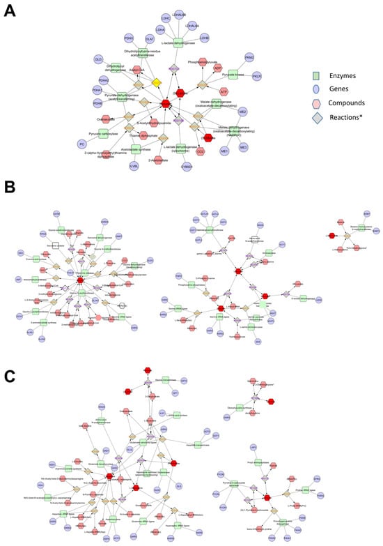 Metabolomics network interaction. Network analysis on plasma metabolites identified by GC–MS (significantly different metabolites on Table 4) was performed using the MetScape 3 App for Cytoscape (http://metscape.med.umich.edu (accessed on 13 September 2024)). (A) Glucose metabolism and gluconeogenesis; (B) glycine, serine, alanine, and threonine metabolism; (C) urea cycle and metabolism of arginine, proline, glutamate, and asparagine. * Each different reaction is reported in the Supplementary Materials.