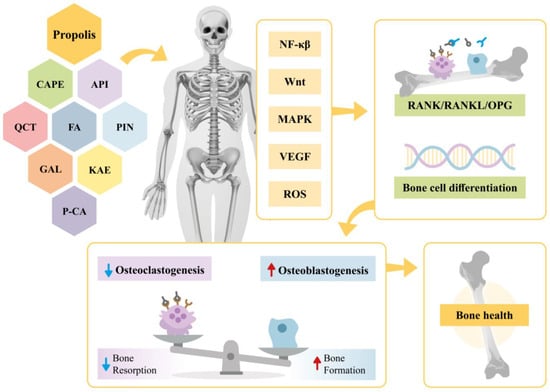 Propolis indeed negatively regulates the activity of transcription factors like NF-κβ [1]. The activation of the NF-κβ pathway by stimuli such as TNF-α and IL-1β is essential for the differentiation of osteoclasts and the expression of osteogenic transcription factors [7]. However, activation of NF-κβ increases bone resorption by osteoclasts and may inhibit bone formation by osteoblasts. By regulating this pathway activity, propolis helps mitigate these effects [1,10].