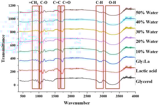 Figure 1 shows the FTIR spectrum of the individual constituents, raw DES, and DES samples with different water concentrations. An FTIR analysis was initially performed to observe the chemical structure and type of bonds present in the DES, and later it was performed to track the bond stretching, shifting, and resulting changes due to water addition. Multiple functional groups were identified in the solvent systems, as shown in the Figure 1. A major dent in the spectra at 3200–3500 cm−1 was associated with the O-H stretching bond, closely followed by C-H stretching ranging from 2500 to 3000 cm−1. Furthermore, C=O stretching was observed at 1710 cm−1, and changes corresponding to C=C allyl stretching was identified in the range of 1615–1682 cm−1. A couple of other bonds identified in the IR spectrum were related to C-O at 1000–1112 cm−1, and =CH2 wagging vibrations were observed ranging from 727 to 1000 cm−1. These bonds were identified in accordance with the information made available by Sigma [] and Rashid et al. []. In the case of lactic acid alone, minimal bond stretching was observed when it comes to the O-H and C-H bonds, whereas the stretching was more pronounced for glycerol, the second constituent of the DES. However, when both these constituents were combined to form the DES solution, the resultant mixtures demonstrated considerable stretching, as observed at wavelengths ranging between 3200–3500 cm−1 and 2500 to 3000 cm−1. These observations validated the formulation of the DES used for subsequent extraction studies. Further differences in peak intensities of the C=O, C-O, and =CH2 bonds can be observed with the changing concentrations of water in different DES mixtures. Overall, the IR spectral analysis confirmed the formation of the eutectic mixtures, implying that the requisite hydrogen bonds were formed, and an increased concentration of water did seem to have altered the chemical structures of the resulting DES combinations.