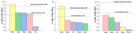 The Plackett–Burman design was selected to screen the significant parameters for subsequent optimization, as this design works on rational planning and statistical discrimination, wherein it generates maximal information from minimal experimentation, reducing the waste of time and energy []. When various factors come into play in an extraction-related experiment, some factors might be more significantly affecting the extraction yield compared to the others, and such behaviour can be identified by performing screening experiments prior to running the response surface design (RSM) []. The ultrasonication time (Time) (min), water bath temperature (Temp) (°C), concentration of water (Water) (%, v/v), ultrasonic amplitude (Amp) (%), solid-to-solvent ratio (S/L), and treatment time (time) were the parameters that were screened using the yields of TAC, TPC, and CT as responses, summarized in Table 2. A total of 13 screening experiments were conducted based on an analysis conducted using Minitab software (Minitab, LLC). Pareto charts showing the influence of specific factors on different responses are shown in Figure 2.
