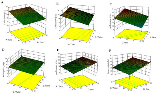 (A–F) Response surface plots for the effects of interactions between Time, Temp, Water, Amp, and the S/L ratio on TAC extraction by combining DES with UAE. The red dots indicate the design points above the predicted values and the yellow dots indicate the design points below the predicted values.