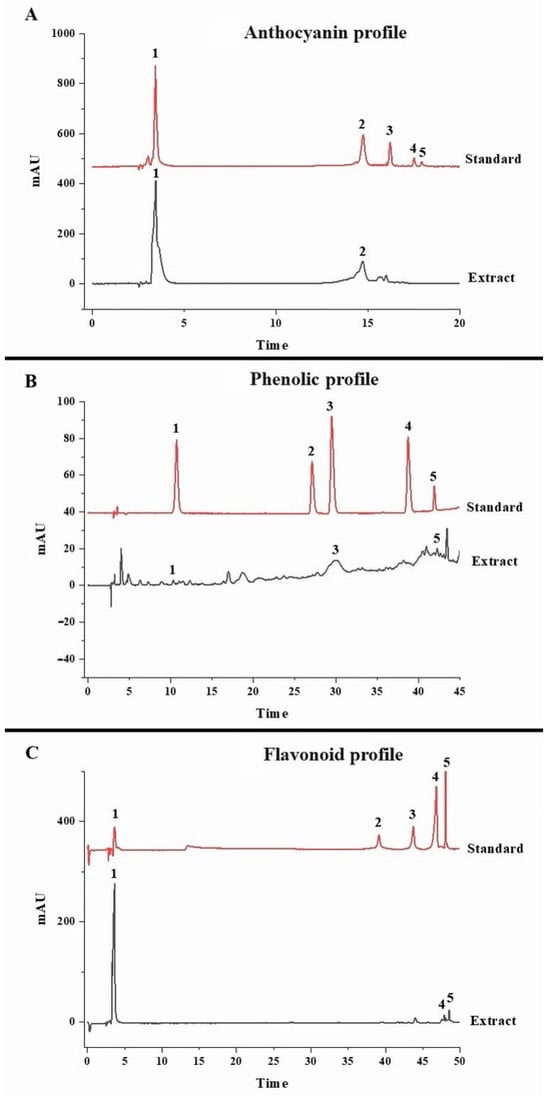 The filtered extracts were passed through a 0.22 µm syringe filter and stored in glass vials with PTFE screw caps. The analysis was conducted using an Agilent 1200 series system (Agilent Technologies, Palo Alto, Santa Clara, CA, USA) fitted with a diode array detector (DAD) employing a C18 column (5 µm, 250 mm, 4.5 mm, Avantor®, Radnor Township, PA, USA).