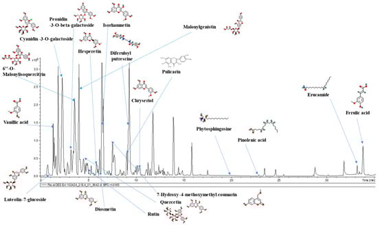 UHPLC-MS chromatogram for the optimized DES extract, identifying some of the bioactive compounds.