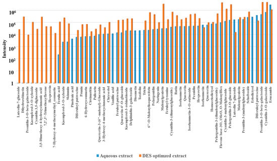 Comparisons of the intensities of bioactive compounds detected in both the aqueous and DES extracts during the metabolomic analysis.
