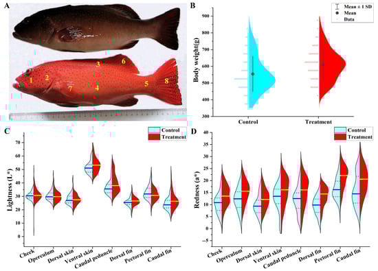 Comparison of growth and body color traits between groups. (A) Appearance and measured areas of P. leopardus in the control group (CB) and the treatment group (TR). The numbers 1–8 represent the cheek, operculum, dorsal skin, ventral skin, caudal peduncle, dorsal fin, pectoral fin, and caudal fin. (B) Comparison of body weight between the CB and TR groups. (C) Skin lightness in the CB and TR groups. (D) Skin redness in the CB and TR groups. The blue and yellow horizontal lines in subfigures C, D represent the mean values, whereas the dashed line indicates 1 standard deviation (SD).