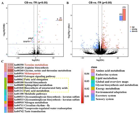Differentially expressed genes (DEGs) and KEGG enrichment analysis. (A) DEGs in skin tissue between groups with the threshold of q < 0.05. (B) DEGs in skin tissue between groups with the threshold of p < 0.05. (C) KEGG analysis of the DEGs between groups. Red indicates pathways involved in melanin synthesis. The yellow box represents DEGs involved in lipid-associated functional pathways.