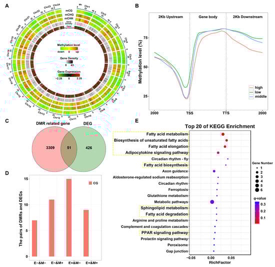 Correlation analysis between DNA methylation and gene transcript levels and KEGG pathway enrichment. (A) Differential methylation and expression distributions at the chromosomal level. (B) Trends in gene expression and DNA methylation within the same genomic regions. (C) Venn diagram of DMGs and DEGs. (D) Correlations between DMGs and DEGs. (E) KEGG pathway enrichment analysis of the overlapping genes. The yellow box represents the common genes enriched in lipid-associated pathways.