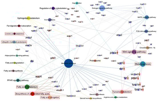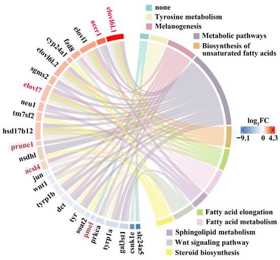 The transcriptomic and methylomic analyses together highlighted the vital role of lipid-metabolism-related categories, such as “Biosynthesis of unsaturated fatty acids”, “Fatty acid elongation”, “Fatty acid metabolism”, and “Sphingolipid metabolism”, in red skin formation. Color ribbons were used to demonstrate the inclusion relation between the candidate genes and functional pathways. Interestingly, numerous candidate genes were upregulated and were modulated by DNA methylation, including elovl6l.1, elovl7, acsl4, and acer1 (Figure 5). In contrast, melanin synthesis pathways were extensively downregulated, such as “Tyrosine metabolism”, “Melanogenesis”, and “Wnt signaling pathway”. These genes involved in black skin coloration were significantly downregulated, including pmel, tyr, tyrp1a, tyrp1b, dct, slc24a5, and wnt1. Notably, the pmel gene, required proper melanosome development, was downregulated by DNA hyper-methylation (Figure 5).