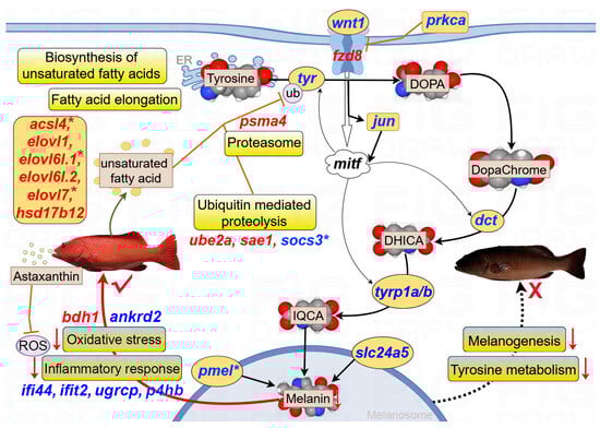 Potential regulatory network based on candidate genes for body color traits of P. leopardus. Key pathways included “Oxidative stress”, “Inflammatory response”, “Unsaturated fatty acid synthesis”, “Ubiquitin mediated proteolysis”, “Proteasome”, “Tyrosine metabolism”, and “Melanogenesis”. Red and blue gene names indicated up- and downregulation, respectively. The star * represented DNA methylation.