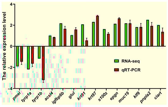 To evaluate the accuracy of RNA-seq, we selected 14 DEGs (pmel, tyrp1a, tyrp1b, acsl4, igfbp6b, glul, krt91, krt97, s100z, epgn, muc19, klf9, pnpla2, and ciart) for validation using qRT-PCR, as summarized in Figure 8. The pmel, tyrp1a, and tyrp1b genes, involved in melanin synthesis, were downregulated, consistent with the RNA-seq results. The acsl4 gene, involved in lipid metabolism, was significantly upregulated in both analyses. In short, the overall strong concordance between qRT-PCR and RNA-seq results underscored the reliability of the findings.