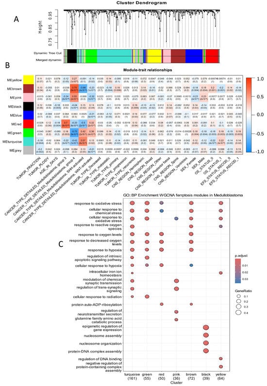 Ferroptosis-related genes identified gene regulatory modules associated with the molecular subtypes and prognosis of medulloblastoma: (A) Gene module clustering was performed based on the expression profiles of ferroptosis-related genes. (B) Correlation analysis between phenotypic traits and gene regulatory modules, identified from ferroptosis-related gene expression, was conducted. Each intersection cell displays the Pearson correlation coefficient and corresponding p-value. (C) A dot plot illustrating functional enrichment analysis for each module, performed using the Gene Ontology Biological Process database.
