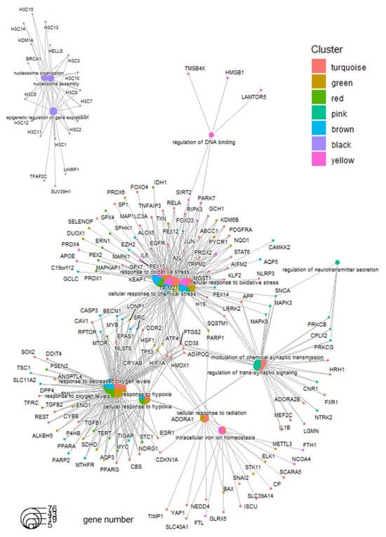 On the other hand, genes belonging to the black module and associated with the recurrence of the disease (Figure 2B) were found to be enriched in epigenetic regulation and nucleosome organization (Figure 2C and Figure 3). The pink module, upregulated in the Group4 molecular subtype, was enriched in its functionalities, such as the regulation of neurotransmitter secretion and of trans-synaptic signaling (Figure 3). Still, regarding the functional enrichment network (Figure 3), the great majority of ferroptosis genes were shared between the response to oxidative stress (enriched in five gene modules: yellow, brown, red, green, and turquoise, associated with the molecular subtypes) and the response to hypoxia (enriched in four gene modules: brown, red, green, and turquoise, associated with the molecular subtypes). The yellow module (Figure 2), implicated particularly in the response to oxidative stress and not in hypoxia, is specifically upregulated in the Group 4 medulloblastoma subtype. The cellular response to radiation, implicating a smaller enriched network (Figure 3), was found to be enriched in the turquoise and green modules and particularly upregulated in the SHH-medulloblastoma subtype.