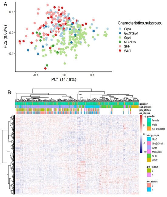 An independent cohort of medulloblastoma tumor RNA-sequencing data was downloaded from the ArrayExpress database under accession number E-MTAB-10767 [26]. This cohort included 331 RNA-sequencing experiments. Most tumor samples were obtained from male children. The validation cohort also included samples from all four molecular subtypes (Table 2); however, overall survival follow-up data were available only for patients in Groups 3 (G3) and 4 (G4) (Table 2). For preprocessing, RNA-sequencing quantifications were transformed into pseudo-counts, normalized using quantile normalization, and batch effects were corrected with the ComBat algorithm (Supplementary Figure S2).
