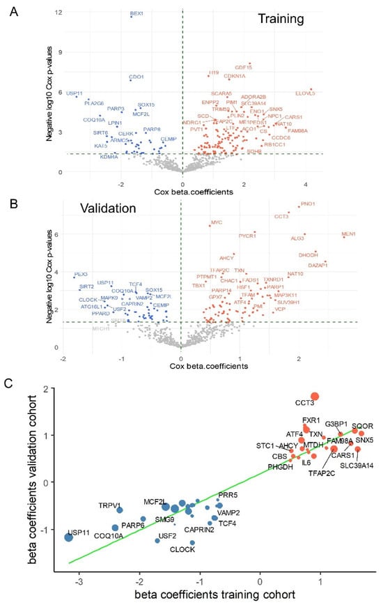Cross-validated ferroptosis signature associated with the prognosis of medulloblastoma: (A) Volcano plot showing beta coefficients versus negative log10 p-values from univariate Cox tests performed on the expression of ferroptosis-related genes in the PBTA training cohort. (B) Volcano plot showing beta coefficients versus negative log10 p-values from univariate Cox tests performed on the expression of ferroptosis-related genes in the validation cohort. (C) Scatter plot of Cox beta coefficients from the two independent cohorts for ferroptosis molecules commonly associated with patient prognosis. The size of the dots represents the mean negative log10 Cox p-values; tomato-colored dots indicate expression associated with unfavorable prognosis, while blue dots indicate expression associated with favorable prognosis. The green line represents the linear regression fit to the data.