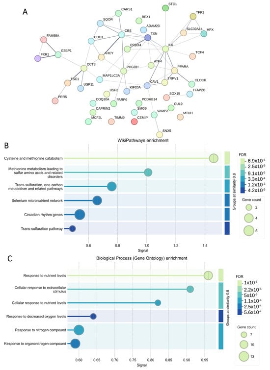 Using the prognostic cross-validated ferroptosis signature (45 molecules, Table 3), a protein–protein interaction (PPI) network was constructed using the STRING proteomics online application (Figure 6A). Functional enrichment analysis of the PPI network with the WikiPathways database highlighted key roles in cysteine and methionine catabolism, followed by trans-sulfuration and one-carbon metabolism pathways (Figure 6B). Further functional enrichment analysis using the Gene Ontology Biological Process database revealed significant involvement in cellular responses to nutrient levels, extracellular stimuli, and decreased oxygen levels (Figure 6C).