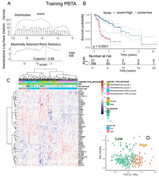 Ferroptosis expression score associated with the overall survival of patients in the PBTA training cohort: (A) Optimal cut-point stratification for the ferroptosis expression score based on overall patient survival. (B) Kaplan–Meier survival analysis and log-rank test for stratification by ferroptosis score in relation to overall patient survival. (C) Expression heatmap and unsupervised clustering (using Euclidean distances) based on the expression profiles of the 45 ferroptosis prognostic molecules. (D) Principal component analysis (PCA) based on the expression of the 45 ferroptosis prognostic molecules, with colors indicating ferroptosis expression score categories.