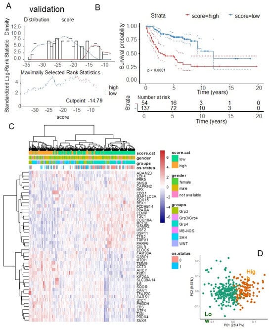 Similarly, in the validation cohort, the ferroptosis expression score was calculated using the expression levels and Cox beta coefficients of the 45 ferroptosis molecules included in the cross-validated signature (Table 3). In this cohort, the overall survival data were available only for patients belonging to the G3 and G4 subtypes [26]. An optimal cut-point for the ferroptosis score based on overall survival was determined for the validation cohort (Figure 8A). A significant difference in prognosis (overall survival) was observed between patients with high ferroptosis scores (n = 54) and those with low ferroptosis scores (n = 137) (log-rank test, p-value < 0.0001, Figure 8B). Specifically, high-ferroptosis-score patients in the validation cohort had a median overall survival of 2.68 years, compared to 12.07 years for low-ferroptosis-score patients.