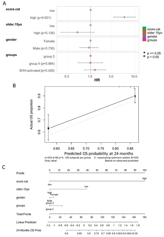 Multivariable overall survival model evaluating the prognosis of medulloblastoma in the PBTA cohort: (A) Forest plot of the multivariable overall survival model, including ferroptosis score categories (score.cat), age at diagnosis (older.15yo), gender, and molecular subtypes of patients as covariates (HR: hazard ratios). (B) Calibration of the multivariable overall survival model using 500 bootstrap iterations for prediction at 24 months of follow-up. (C) Nomogram of the calibrated overall survival model for predicting prognosis at 24 months of follow-up.