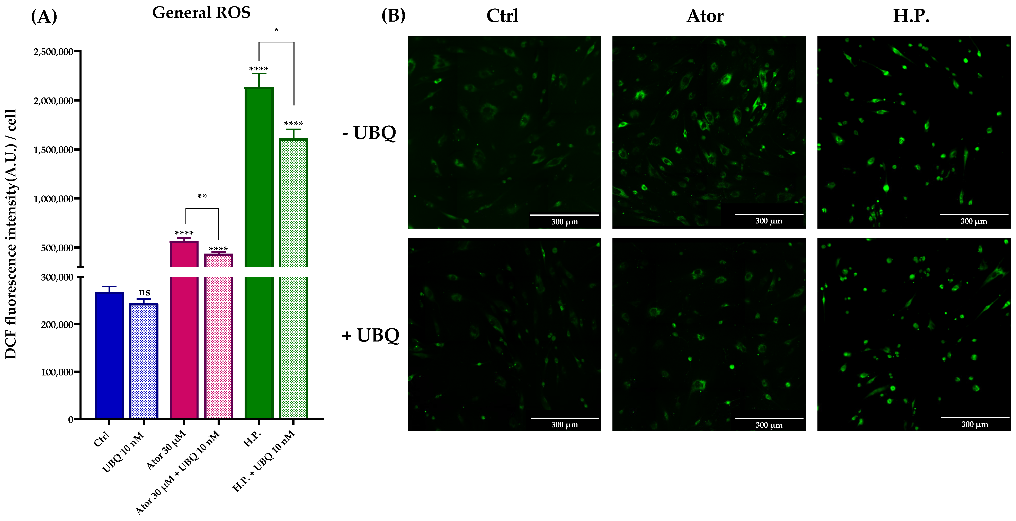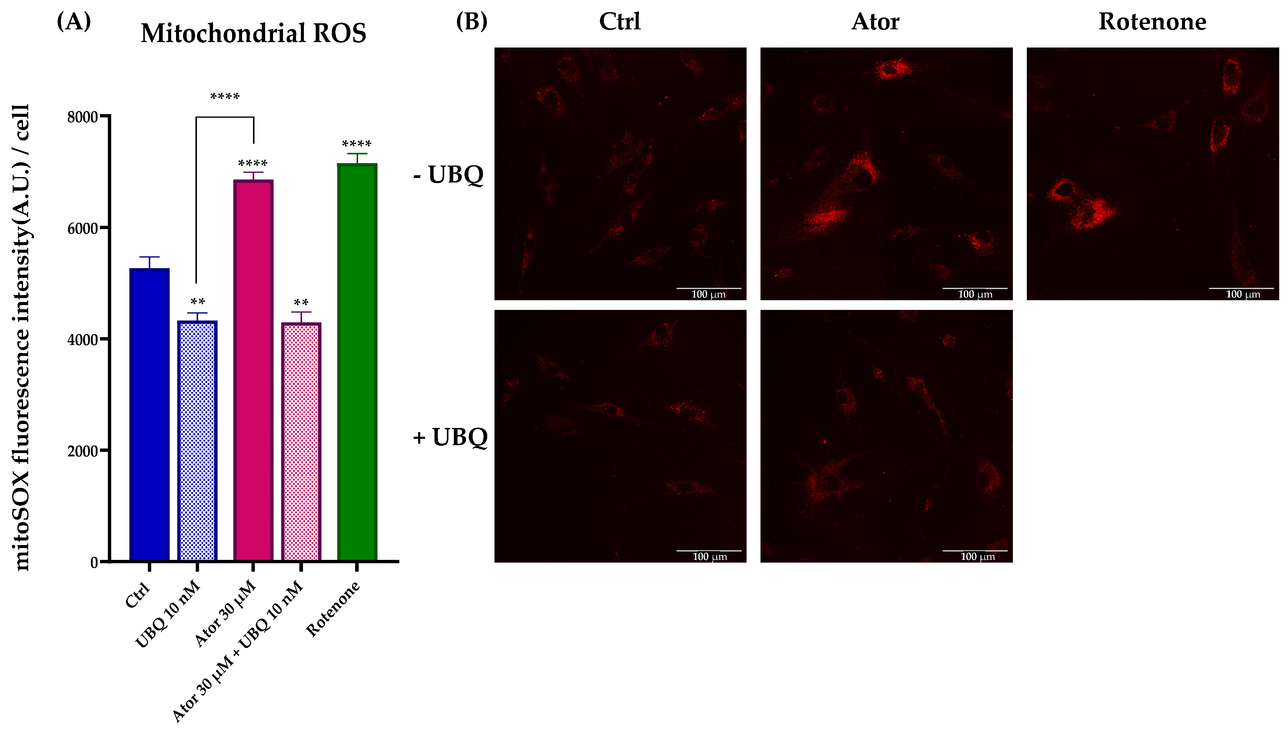 3.3. Effect of Atorvastatin on ROS Levels in HDF and Isolated Mitochondria