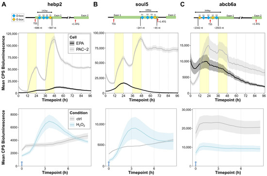 Visible light has been shown to induce ROS production in zebrafish cells, and the D-box enhancer is known to be necessary for the response to ROS, providing one mechanism by which light activates D-box-driven transcription. Previous studies have demonstrated that ROS increases alone significantly upregulate the expression of the D-box-controlled circadian clock and DNA damage repair genes in PAC-2 cells [23,24,45]. To test whether this also applies to abcb6a, hbp2, and soul5, PAC-2 cells were treated with 300 μM hydrogen peroxide, and gene expression was assessed via RT-qPCR compared with controls kept in constant darkness (Figure 4A). The treatment led to the upregulation of all three genes after 3, 6, and 9 h of treatment (Figure 4B).