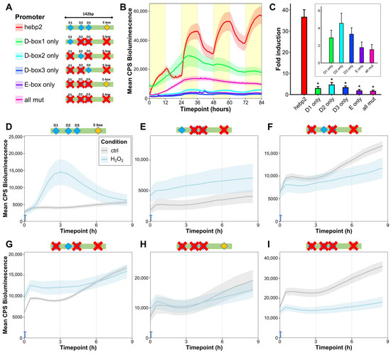 D-box enhancers mediate light- and ROS-responsiveness of promoters of mitochondrial and heme-related genes. (A) Schematic representation of hebp2-Luc mutated constructs. The promoter fragment was mutated (indicated by red crosses) so only one predicted D-box or E-box element (or none) was retained. (B) Representative (of 3) in vivo bioluminescence assay in PAC-2 cells transfected with hebp2-Luc and its mutant constructs exposed to LD cycles. Mean bioluminescence (CPS) as a function of time (hours) is plotted. Lines show mean ± SEM across N = 6 wells. Lights-on periods are indicated by the yellow boxes. (C) In vitro bioluminescence assay of PAC-2 cells transfected with hebp2-Luc and its mutant constructs following 8 h exposure to blue light. Fold induction of relative bioluminescence levels compared with controls kept in darkness at a single timepoint, ± SEM (n = 3), is plotted on the y-axis. The β–galactosidase assay was used to normalize for transfection efficiency. Differences between the unmutated hebp2-Luc construct and each of the mutant constructs are compared via pairwise t-tests with Bonferroni correction. Detailed statistical analysis can be found in Supplementary Dataset S1. p < 0.5, p < 0.01, and p < 0.001 are represented by *, **, and *** respectively. (D–I) In vivo bioluminescence assays in PAC-2 cells treated with H2O2 after transfection with hebp2-Luc and its mutant constructs and kept in complete darkness. Traces from cells treated with 1 mM H2O2 starting at 0 h (blue arrow) are plotted in light blue; untreated controls are plotted in gray.