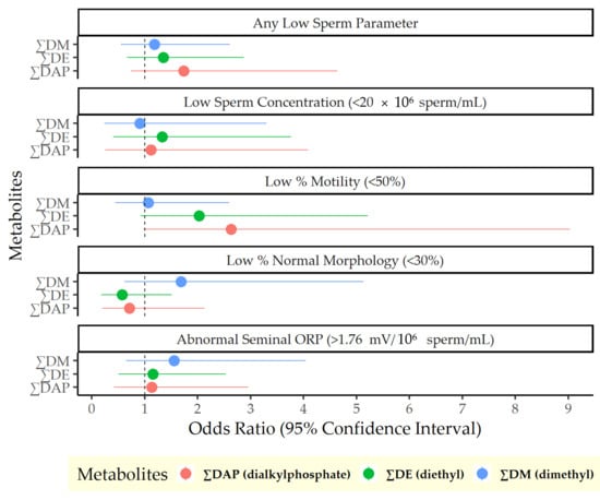 In this study, OP pesticide exposure was associated with lower semen quality, driven by an inverse association between ∑DAP metabolites and normal sperm motility. This relationship was not mediated by seminal ORP, however, which was not associated with OP pesticide exposure or sperm motility. Seminal ORP was inversely associated with sperm concentration, modeled both continuously and dichotomously, in keeping with findings from prior studies [45,46,47].