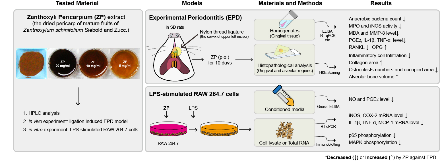 According to the Korean Pharmacopoeia, Zanthoxyli Pericarpium (ZP) refers to the dried pericarp of mature fruits of Zanthoxylum piperitum De Candolle, Zanthoxylum bungeanum Maxim., or Zanthoxylum schinifolium Siebold and Zucc. Traditionally, it has been used in East Asian medicine to manage intestinal disorders such as stomach pain, indigestion, and diarrhea [15]. Recent pharmacological studies have reported that ZP extracts exert protective effects against dextran sodium sulfate-induced colitis and carbon tetrachloride-induced hepatotoxicity, suggesting anti-inflammatory and antioxidant properties of ZP [15,16]. Although dysregulated inflammation and excessive oxidative stress are also key mechanisms in the pathogenesis of periodontitis, the efficacy of ZP in this disease has not yet been elucidated. Therefore, the present study investigated the protective effects of ZP (extracted from Z. schinifolium Siebold and Zucc.) in a ligature-induced experimental periodontitis (EPD) rat model, focusing on its potential antimicrobial, anti-inflammatory, antioxidant, and bone-protective actions. Based on these properties, we hypothesized that oral administration of ZP would attenuate periodontal inflammation, oxidative stress, and alveolar bone loss. To further explore the underlying molecular mechanisms, we examined its effects in lipopolysaccharide (LPS)-stimulated RAW 264.7 macrophages. By combining both in vivo and in vitro experiments, this study provides novel evidence supporting ZP as a promising candidate for periodontal therapy.
