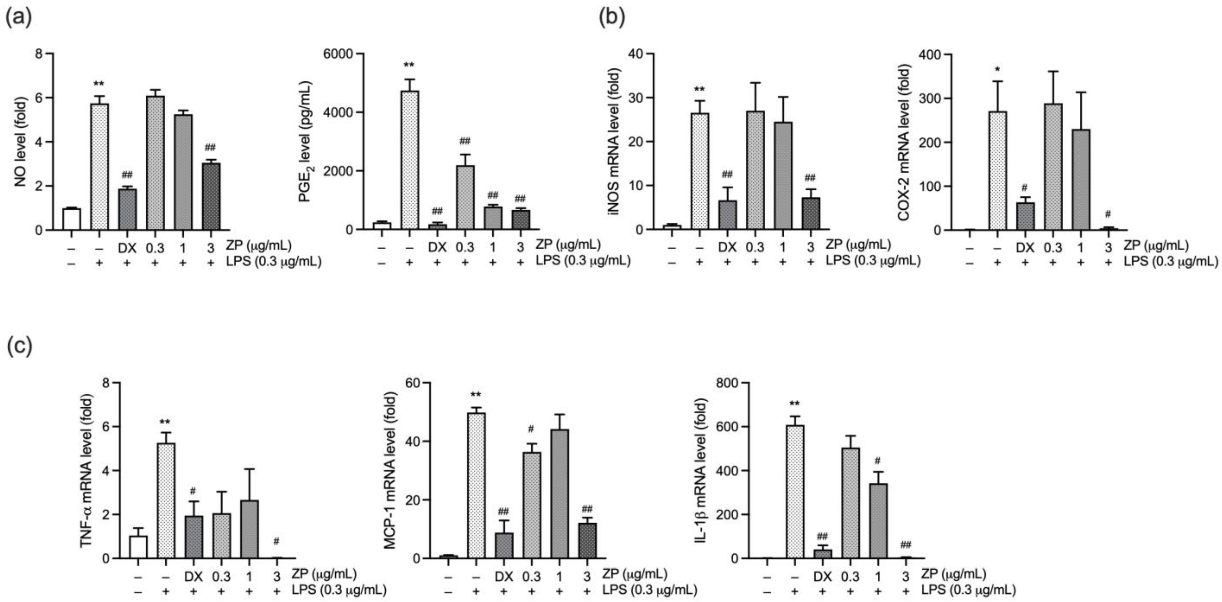 To investigate the potential anti-inflammatory role of ZP, we examined its influence on the production of inflammatory mediators in LPS-stimulated RAW 264.7 macrophages. Before assessing its anti-inflammatory activity, we evaluated whether ZP affected the viability of HaCaT (human keratinocytes), HDFn (neonatal human dermal fibroblasts), and RAW 264.7 (murine macrophage) cells. No significant reduction in cell viability was observed in any of the cell types following treatment with ZP (0.001–10 mg/mL) (Supplementary Figure S3). Next, cells were pre-incubated with ZP (0.3–3 mg/mL) or DX (1 μM) for 1 h and further exposed to LPS (0.3 μg/mL). After 18 h of incubation, levels of NO and PGE2 were measured in the culture supernatant. As expected, LPS significantly elevated NO and PGE2 levels compared to the vehicle-treated group. However, ZP treatment suppressed both NO and PGE2 levels in a dose-dependent manner, with a significant reduction at the highest concentration (3 mg/mL) (Figure 1a). In addition, we assessed the mRNA expression of iNOS and COX-2, which are responsible enzymes for NO and PGE2 synthesis, respectively. LPS markedly upregulated both iNOS and COX-2 mRNA levels compared to the vehicle-treated group, whereas 3 mg/mL of ZP significantly reduced their expression (Figure 1b). In a separate experiment, the expression of pro-inflammatory cytokines, including TNF-α, monocyte chemoattractant protein-1 (MCP-1), and IL-1β, was evaluated after 6 h of LPS exposure. Pretreatment with 3 mg/mL of ZP significantly downregulated the mRNA levels of all three cytokines (Figure 1c). These findings suggest that ZP mitigates LPS-induced inflammatory responses by inhibiting the production of inflammatory mediators.