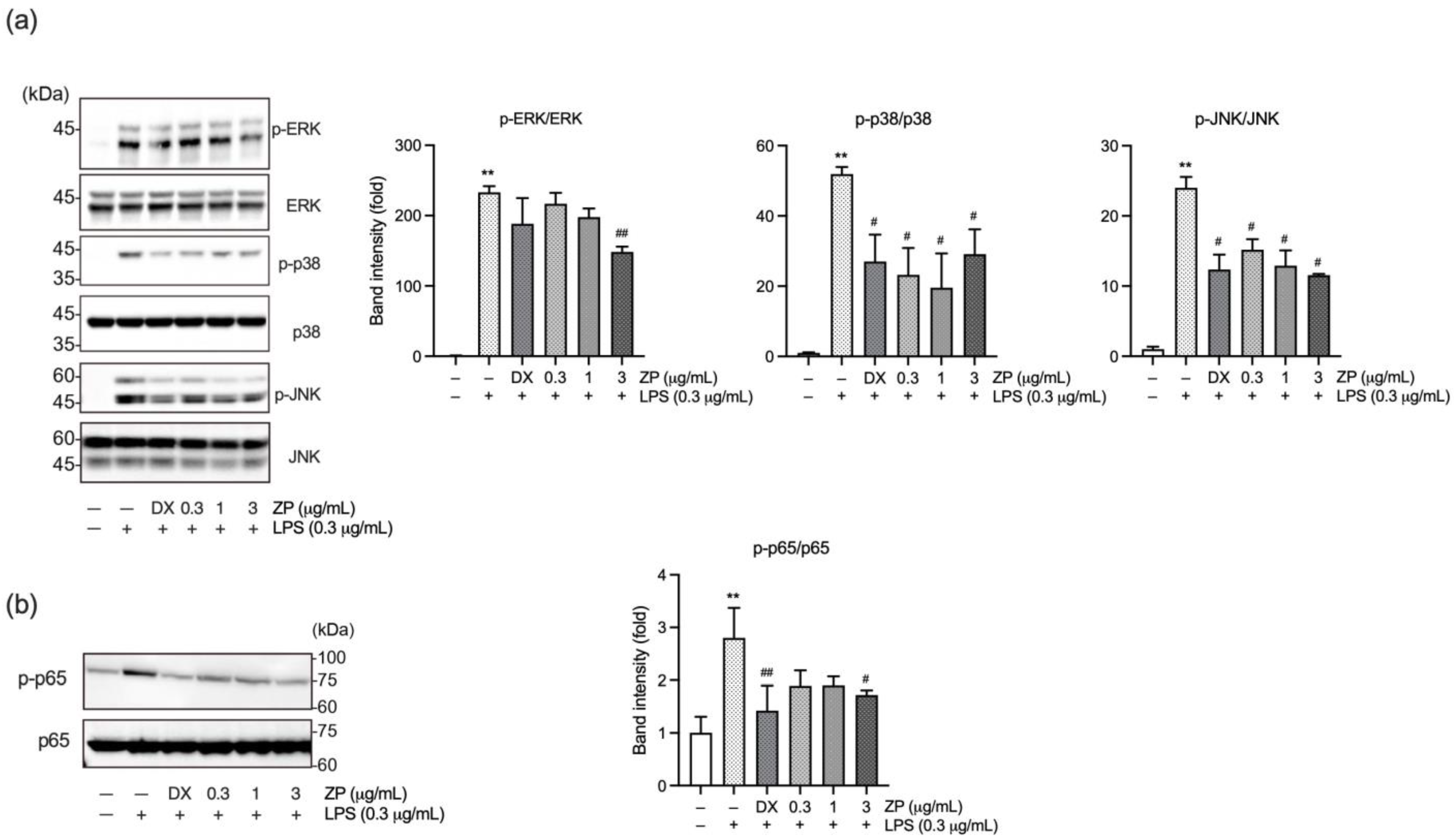 Figure 2. ZP attenuates LPS-induced inflammation through suppression of mitogen-activated protein kinase (MAPK) and nuclear factor-κB (NF-κB) pathways. RAW 264.7 macrophages were incubated with DX (1 μM) or ZP (0.3–3 mg/mL) for 1 h and subsequently stimulated with 0.3 μg/mL of LPS (0.3 μg/mL) for 30 min. Phosphorylated and total forms of (a) MAPKs and (b) p65 were examined by immunoblotting, with the intensity of each phosphorylated band normalized to its corresponding total protein. Significance versus vehicle-treated group, ** p < 0.01; versus LPS-treated group, # p < 0.05, ## p < 0.01.