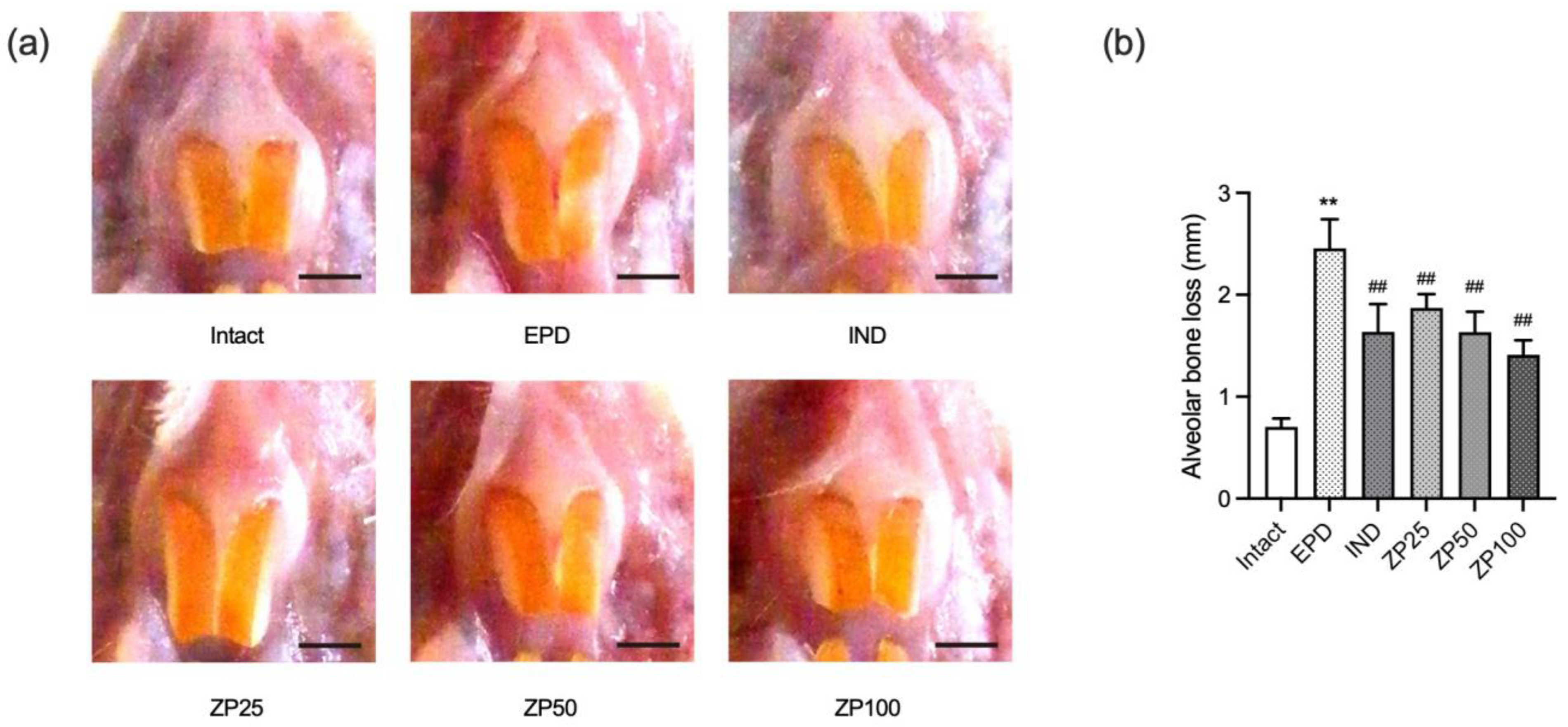 Figure 4. ZP attenuates alveolar bone loss in EPD rats. (a) Representative images of the upper left incisor region showing the ligature placement site. Scale bars = 3.00 mm. (b) Quantitative analysis of horizontal alveolar bone loss, determined as the cusp tip to bone surface distance, was measured along the axis of the upper left incisor. Data are presented as mean ± SD from ten animals per group. Significance versus intact vehicle control group, ** p < 0.01; versus EPD control group, ## p < 0.01.